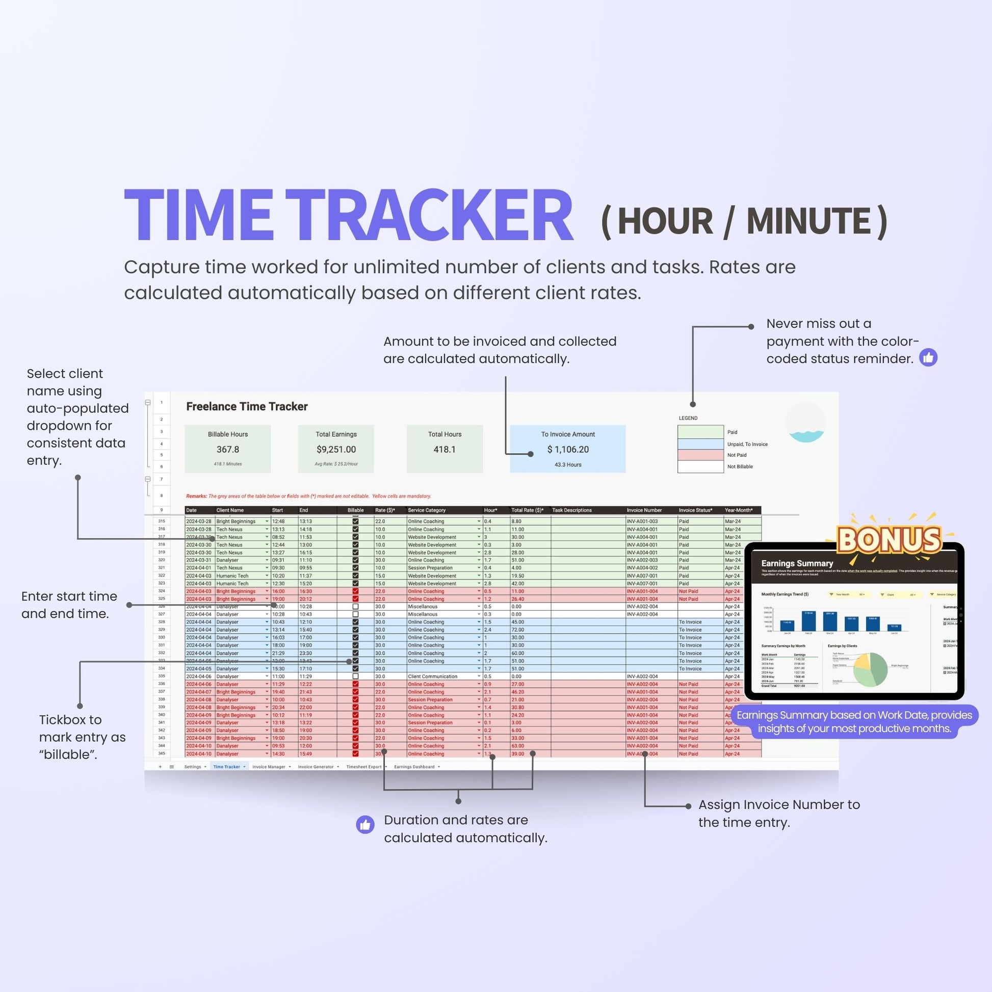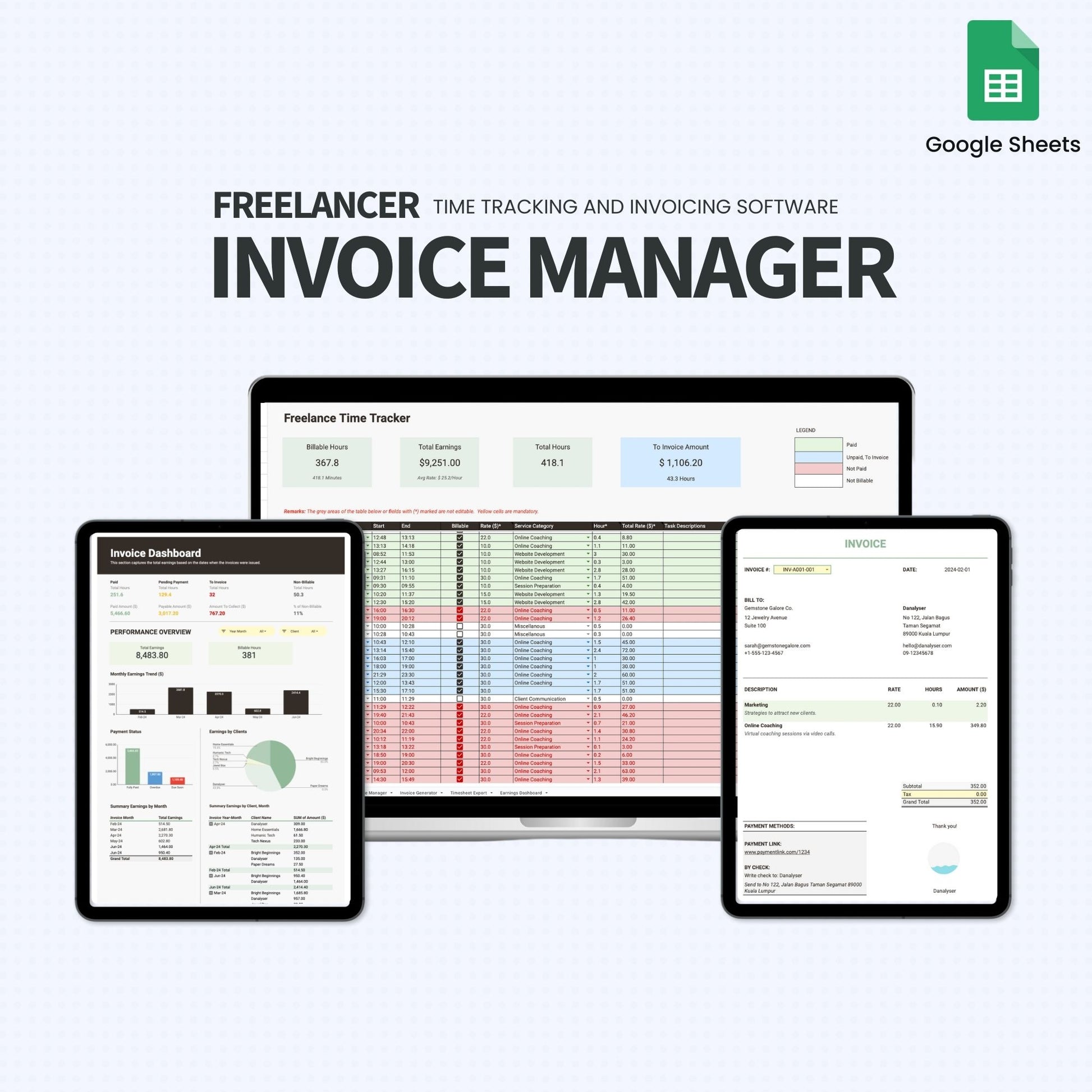 There are many time tracking apps available like Toggl and Harvest, but the Freelancer Invoice Manager offers unique advantages by integrating time tracking, invoice tracking, invoice generation and management all within a single spreadsheet.