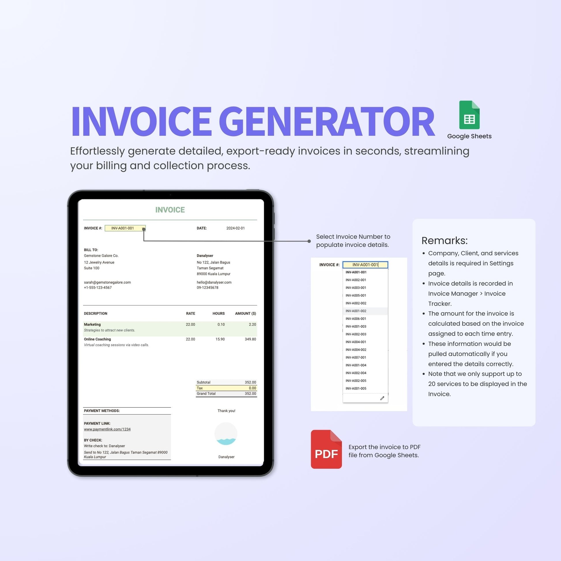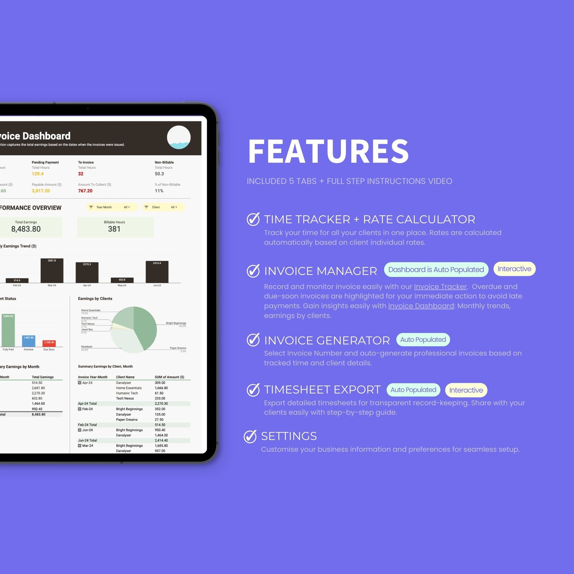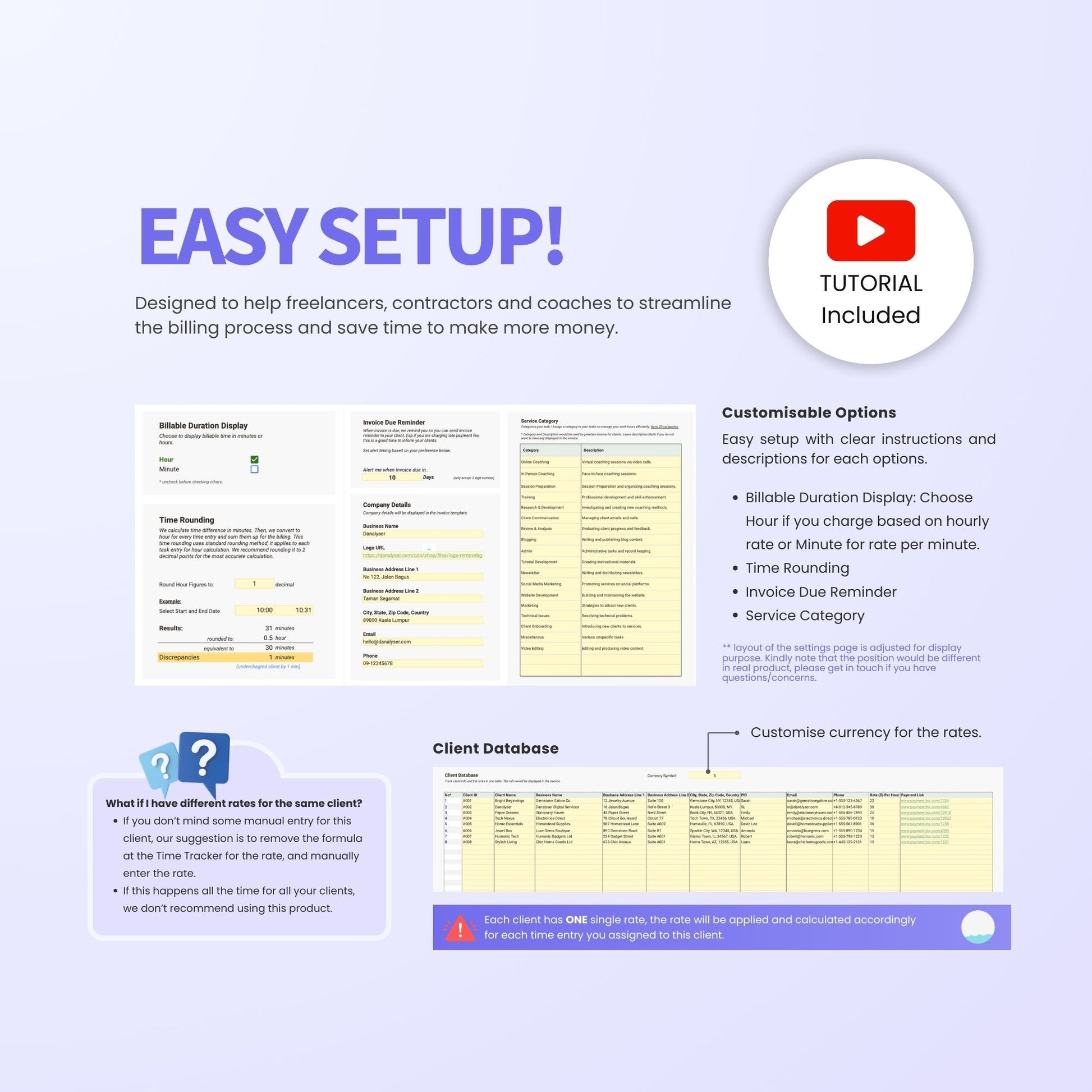 - Settings: Customise your business information and preferences for seamless setup. Consists of a Client Database Tracker to keep track of client info for invoicing and individual rate for bill calculation.