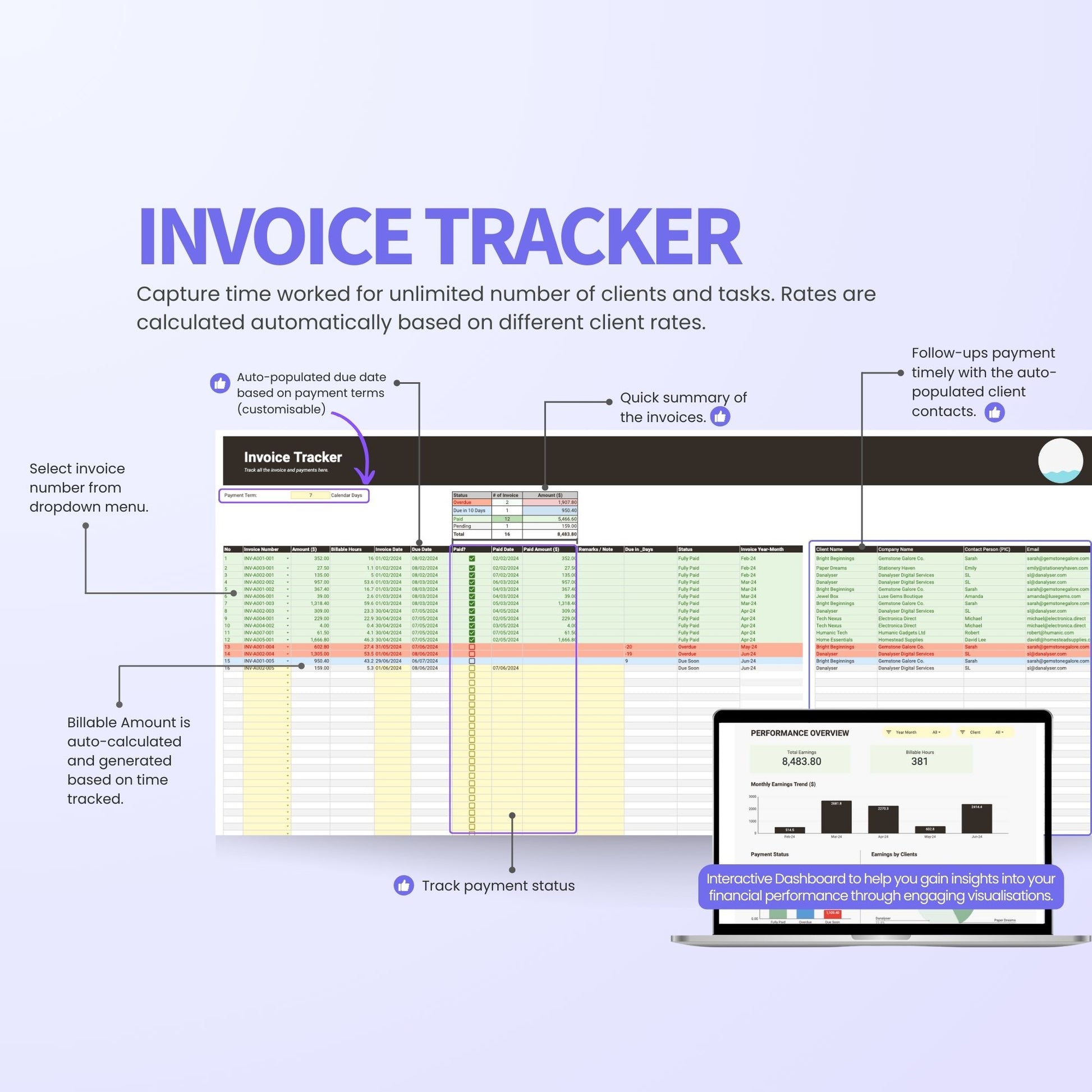 - Invoice Tracker: Monitor invoice statuses and manage client billing effectively.