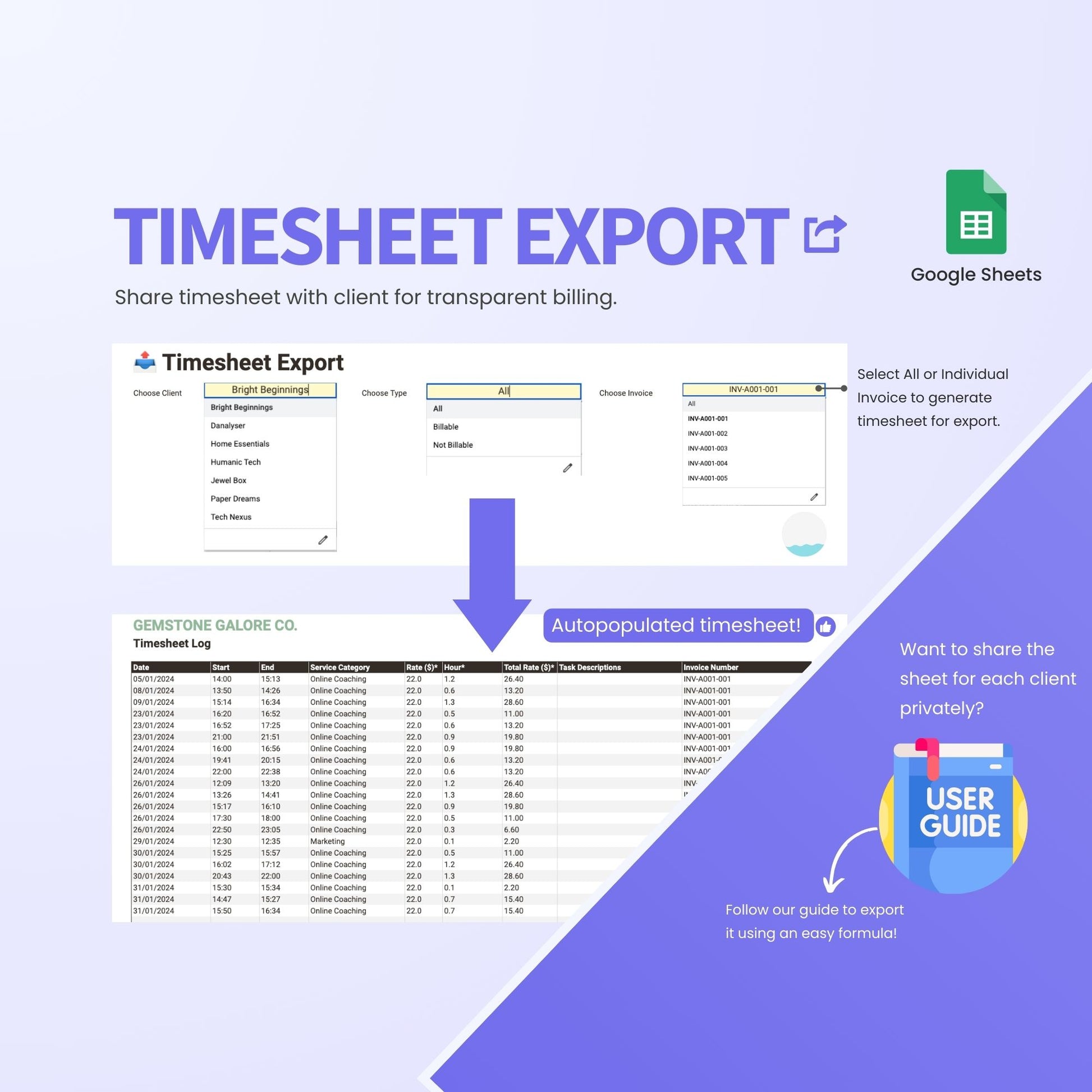 - Timesheet Export: Export detailed timesheets for transparent record-keeping.