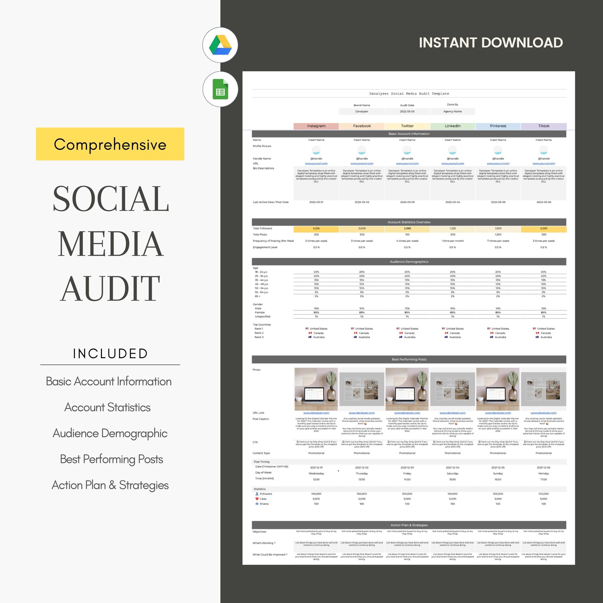 This Social Media Audit Template is designed to help Social Media Managers offer quick & free social media audits to attract more potential clients. It’s easy to use, professionally designed and can be reuse multiple times.