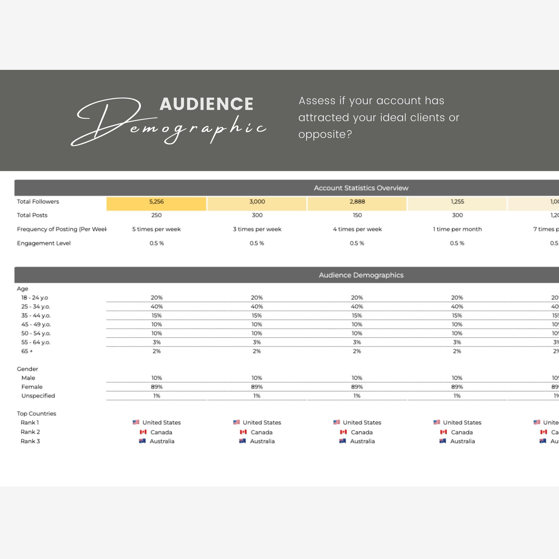Audience Demographic. Jot down your audience demographic characteristics, including age groups, gender, geographical distribution. This helps you evaluate if your account has attracted your ideal clients, and not the opposite.