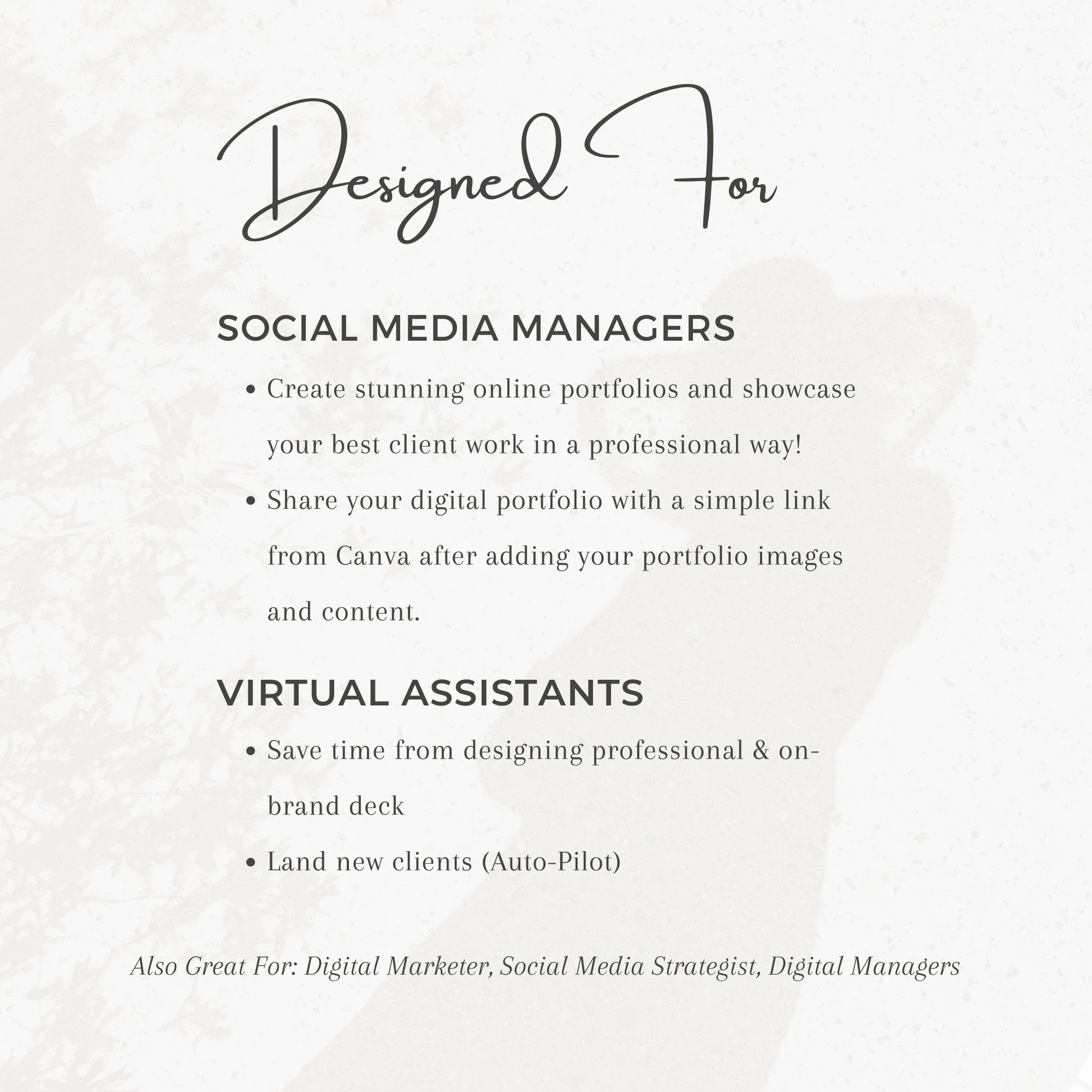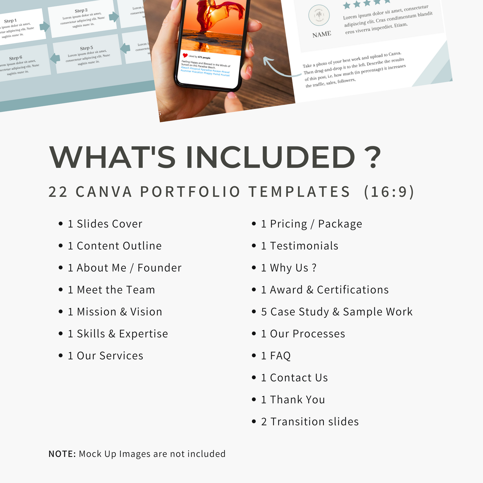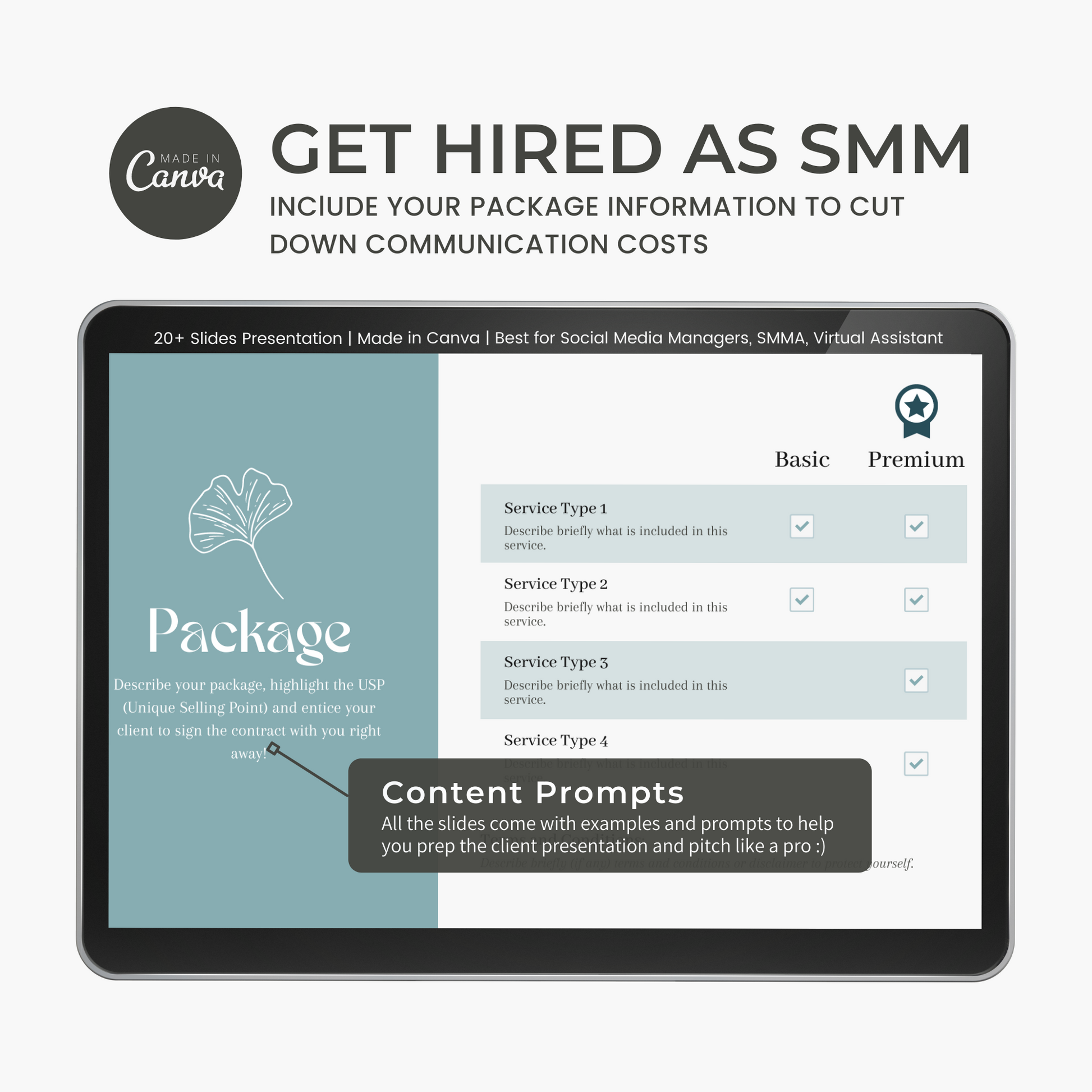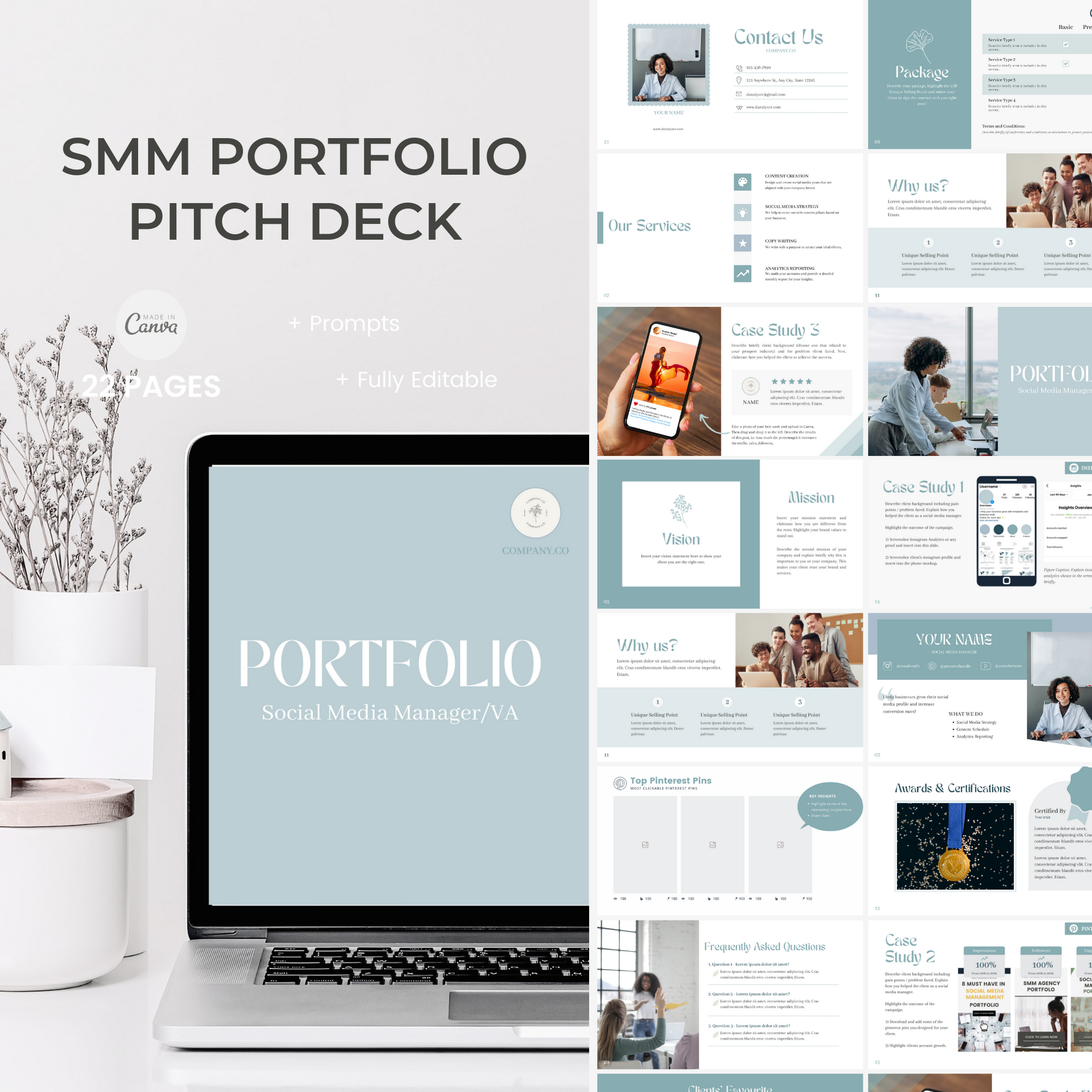 Icons, Graphics: Can be removed and select one you like from Canva library. Colour of most icons can be edited to fit your branding.