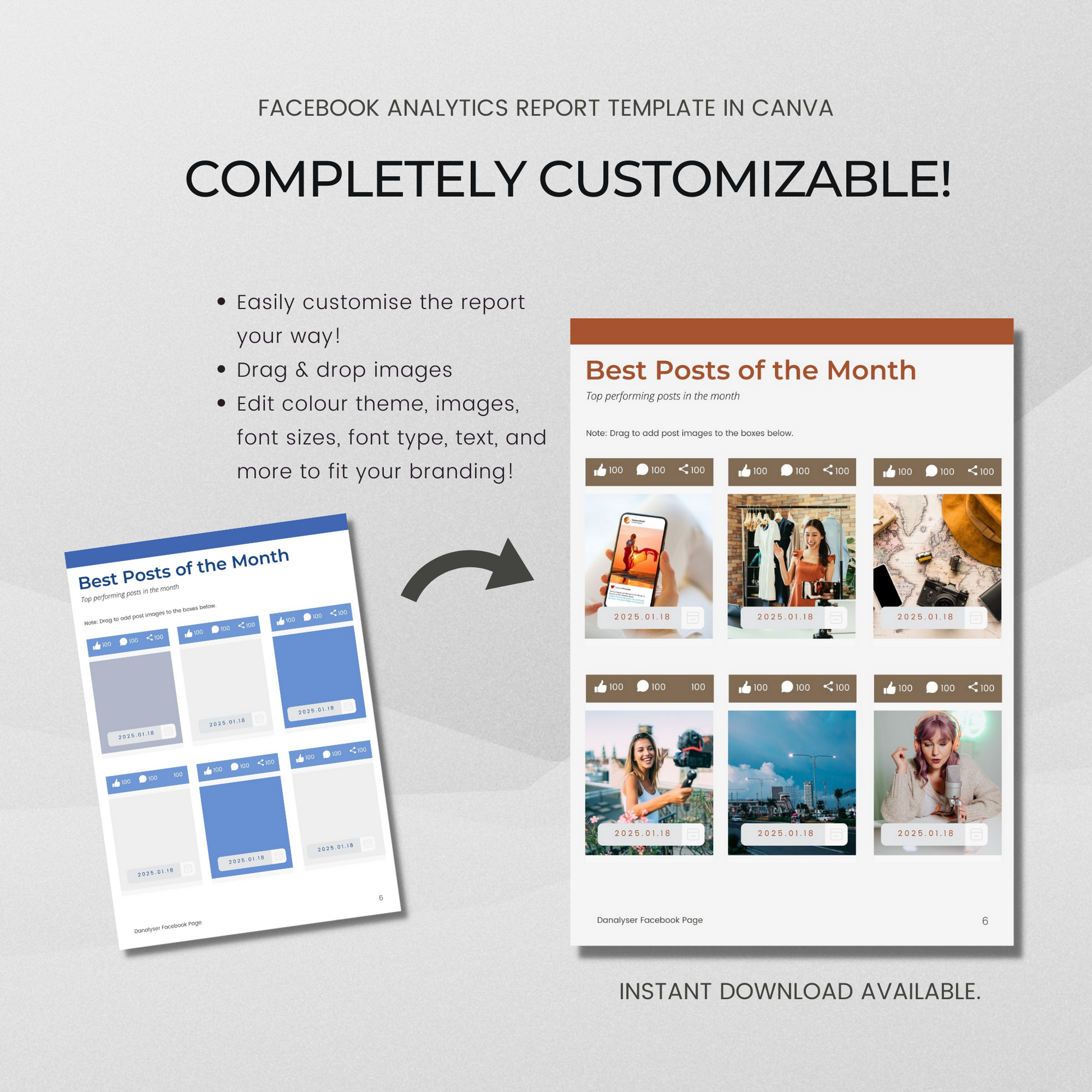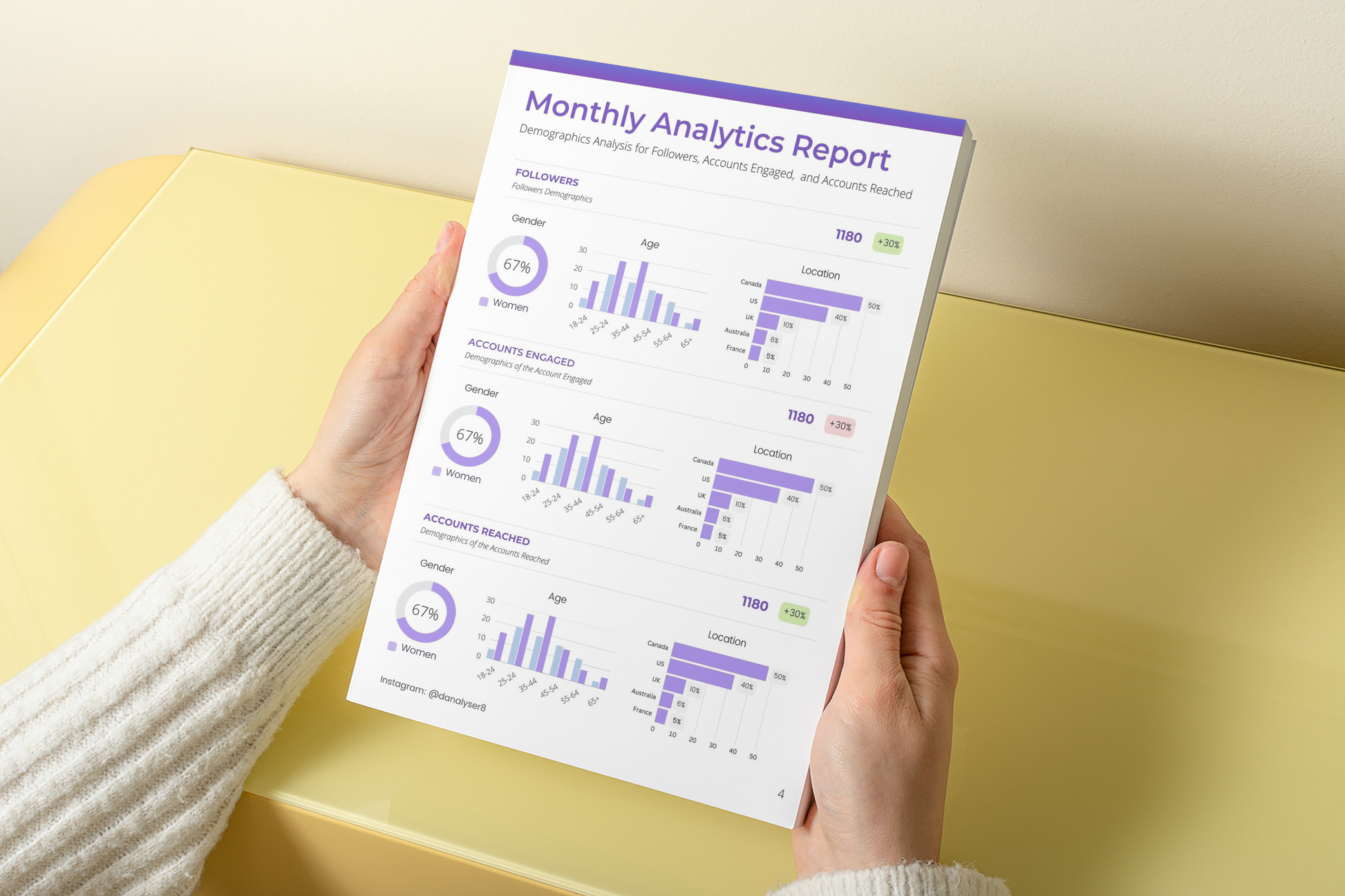 👉🏻 6 A4 Pages of Social Media Insights Report Canva Template. with content prompts and example, custom-made & fully editable infographics, charts and graphs for your storytelling ! (Instagram version comes with an extra page for audience demographics comparisons, you may check the photos to see the design before purchasing.)